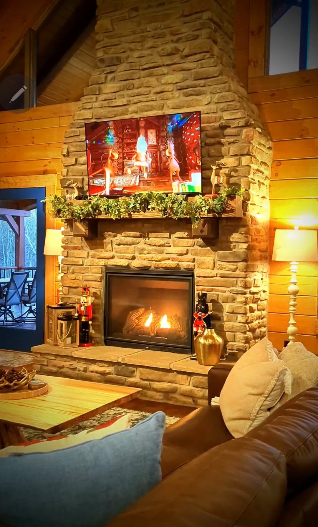 Our great room is fully decorated with garlands, soft lighting, and a warm stone fireplace — the heart of your winter getaway. Whether you’re watching movies, opening gifts, or just relaxing, this is where families gather.